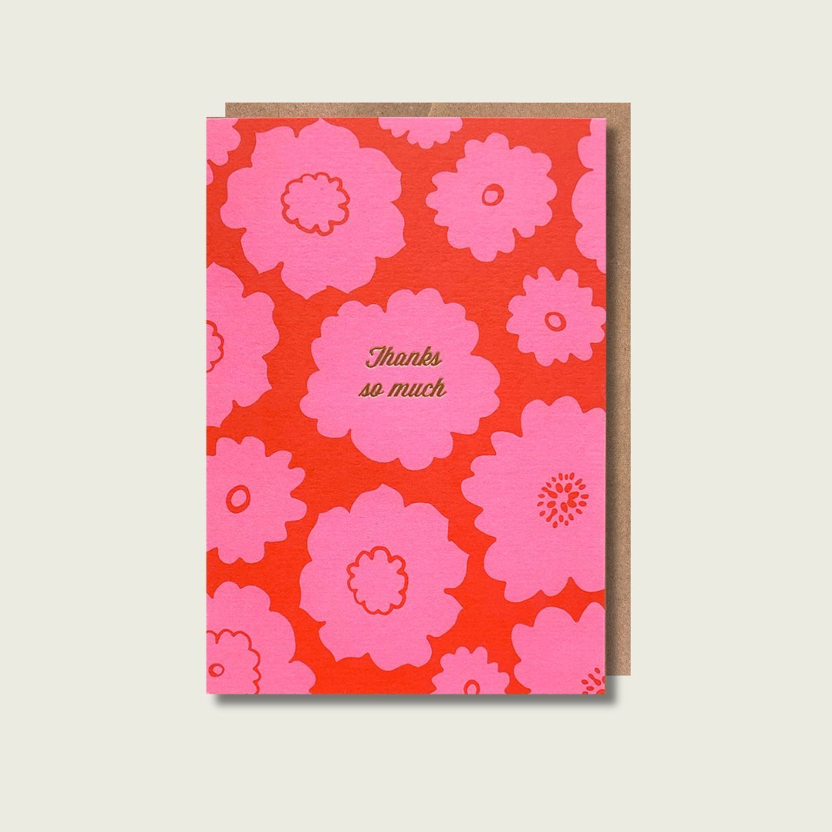 A hot pink and red card with the words Thanks So Much in gold foil, decorated with abstract florals.