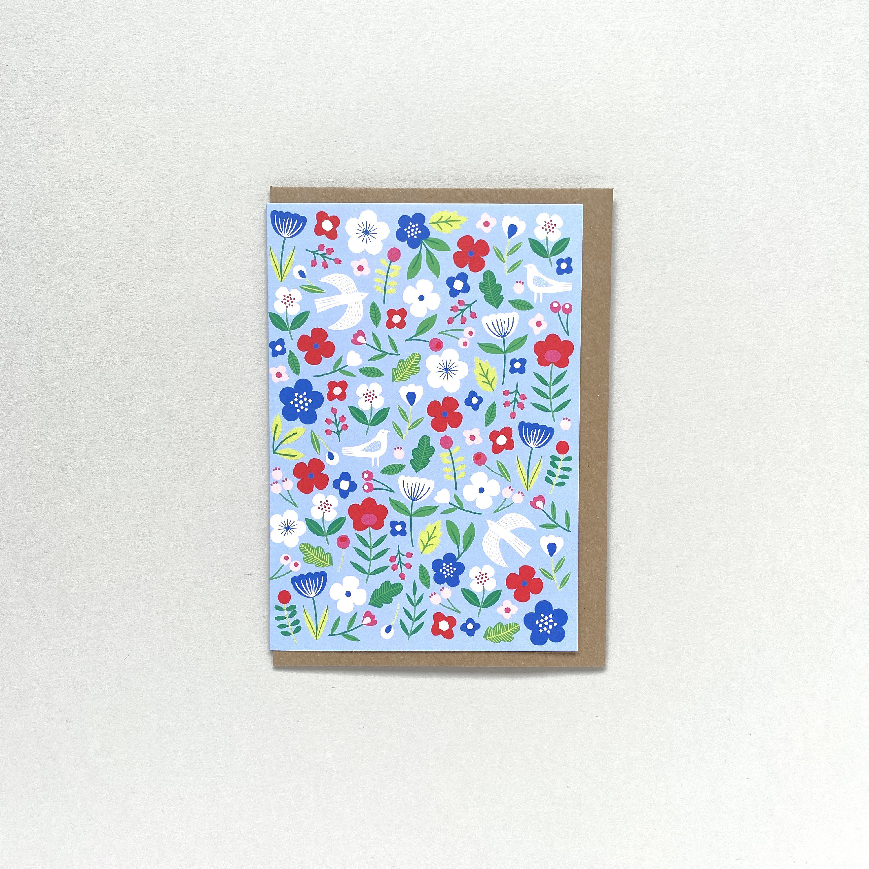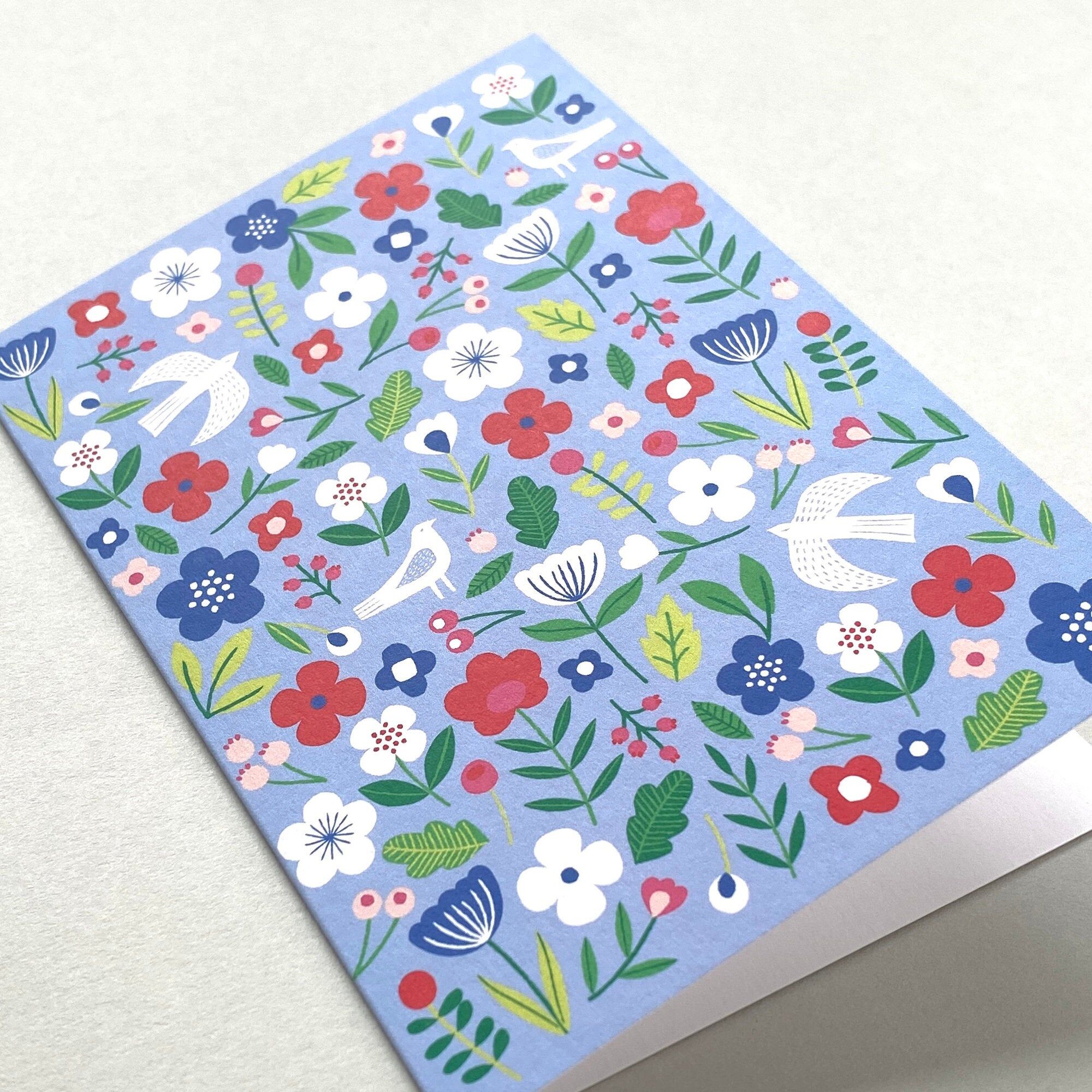 Flowers & birds pattern on a pale blue background. Ideal for all sorts of occasions.