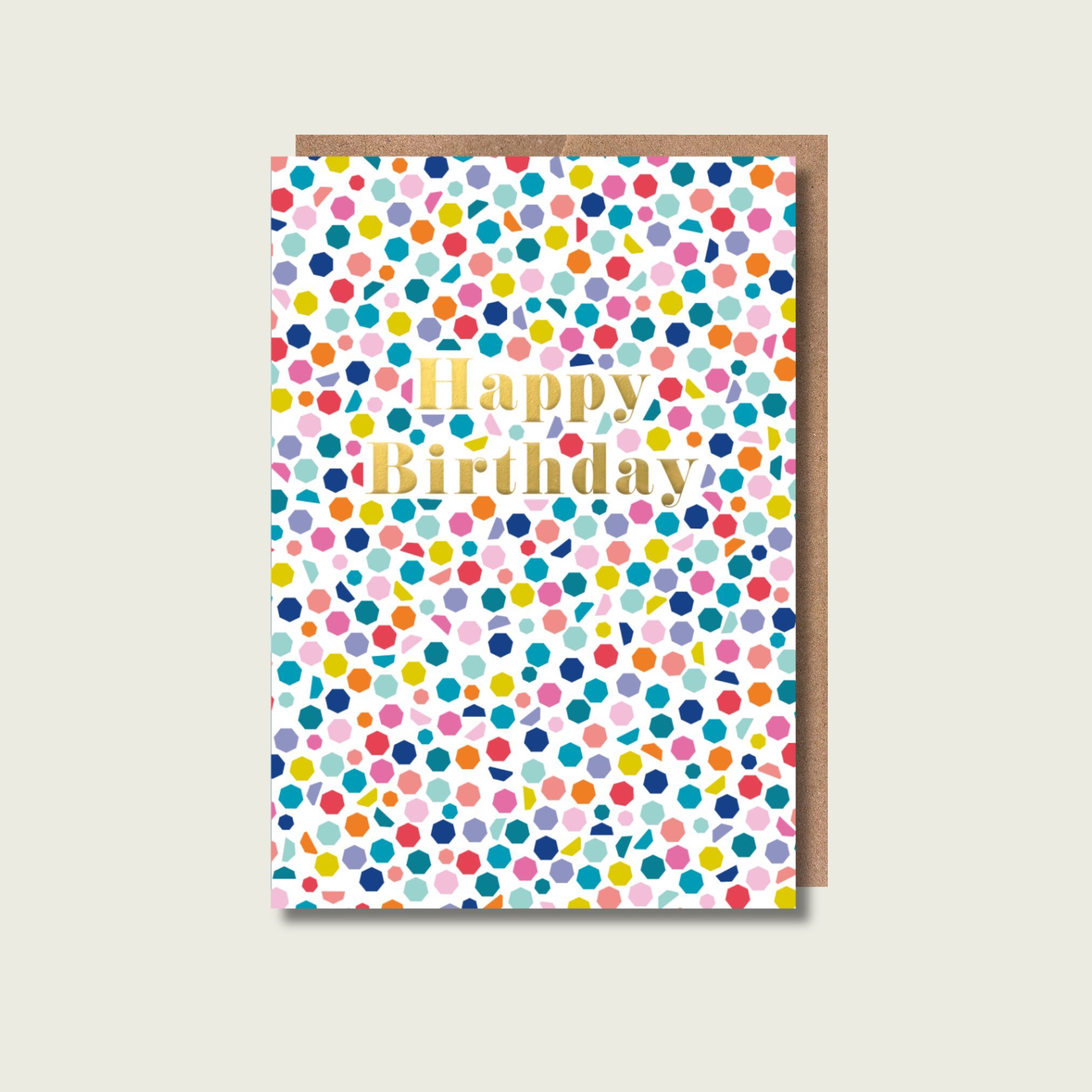 Bright and vibrant birthday card featuring a colourful confetti pattern and gold foil 'Happy Birthday'. Perfect to send to someone who loves contemporary design.