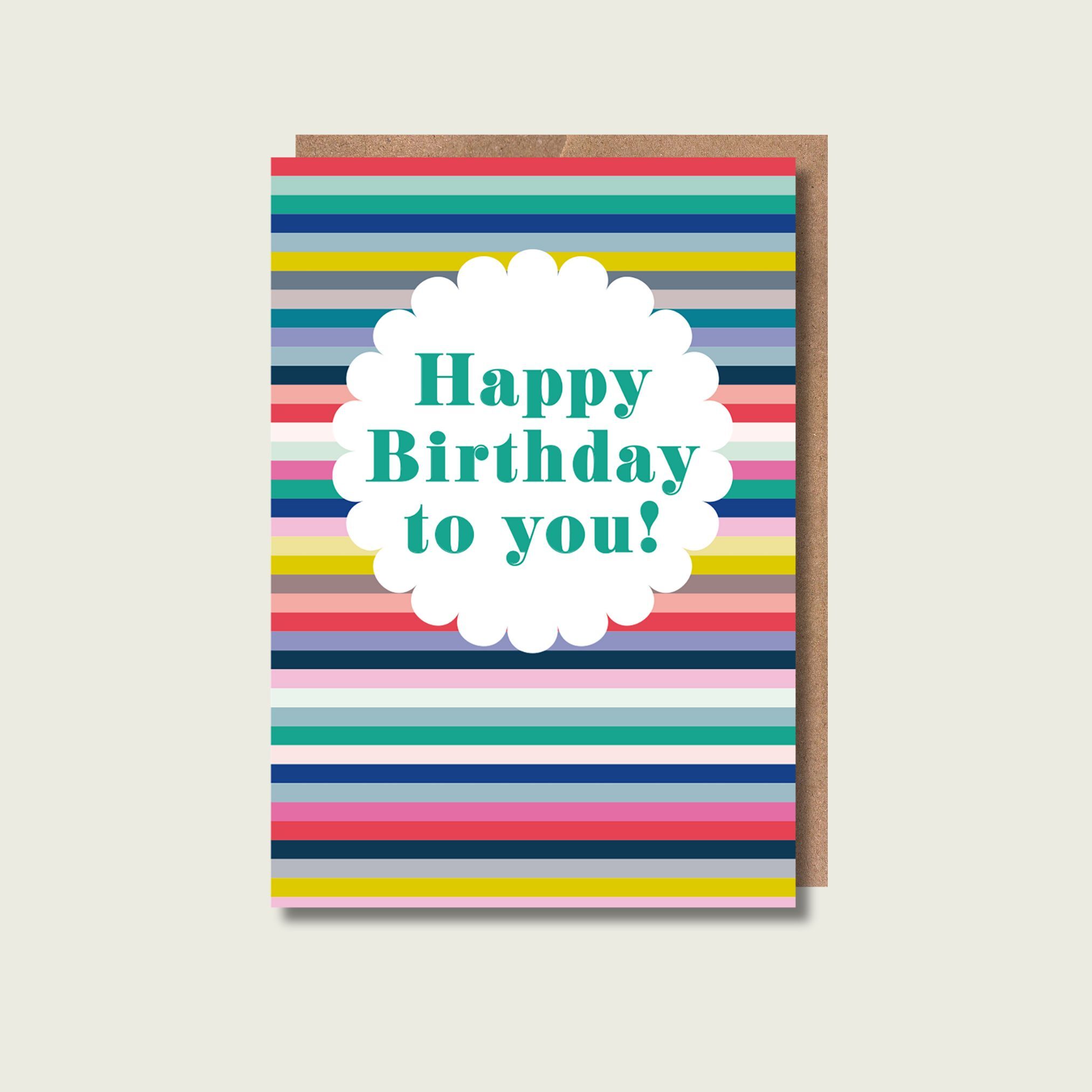 Bright and fun rainbow striped pattern birthday card with the words 'Happy birthday to you!!'