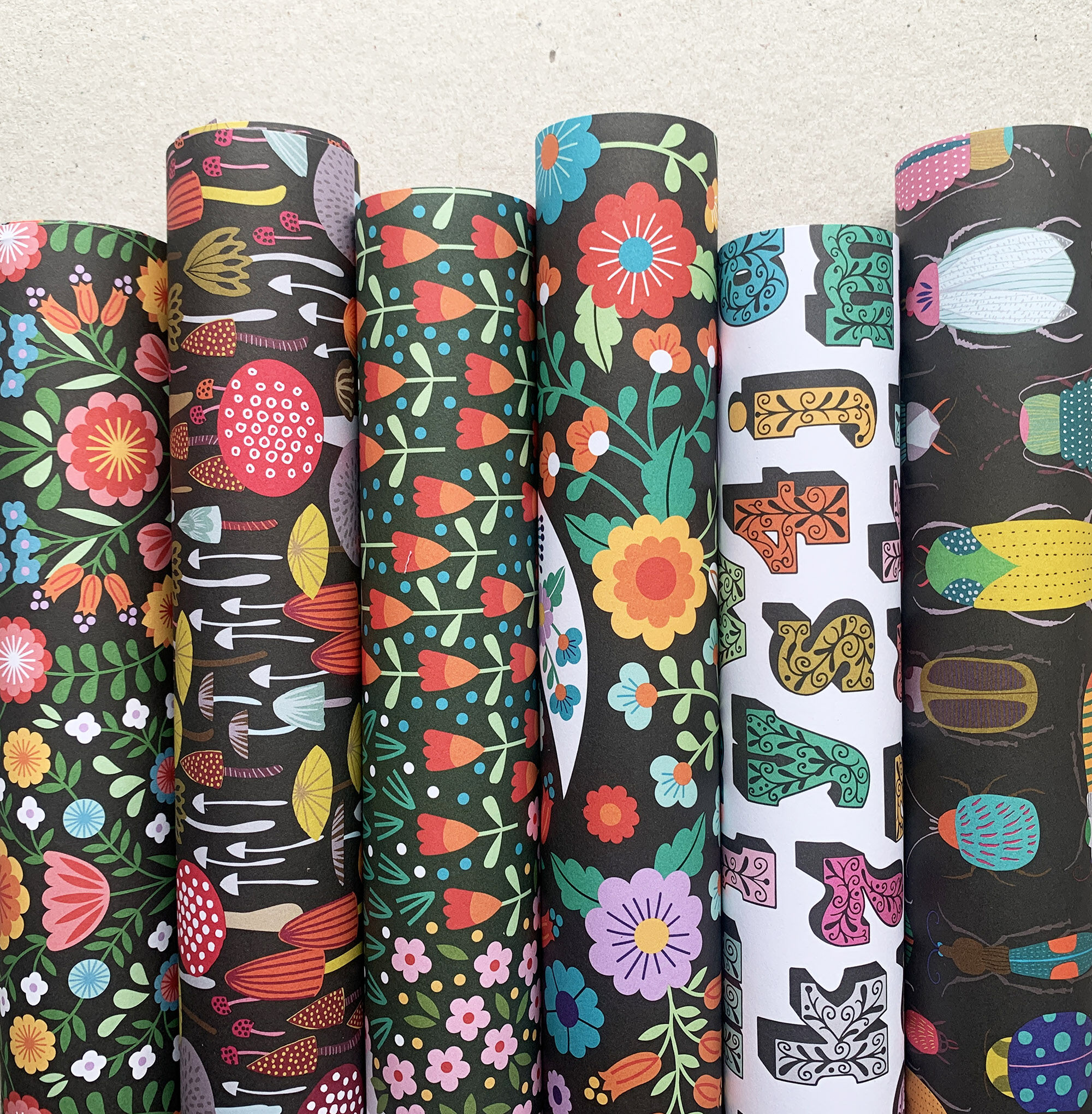 6 of my favourite designs on beautiful wrapping papers. These designs are full of personality in vibrant bright colours. Folk florals, decorative letters, bugs & beetles, toadstools, cute little cottages & birds. A really affordable piece of art for your walls, or dream gift wrap to make your presents extra special.